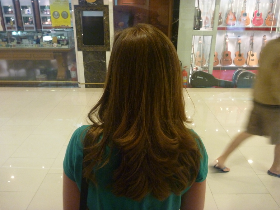 After taking a little snooze on Eric's shoulder, I decided it was time to get my hair cut (calm down Debbie, it's not short!). I looked through a couple books and came up with something. I managed to get good service for my money, but I didn't get exactly what I wanted. I went in knowing that I could possibly get butchered because I have no idea how to tell them what I want. I had 3 different people work on my hair. The first lady washed my hair and I got a scalp massage. I sat down and lady 1 and 2 went at trying to comb my hair. There is a reason that I don't brush my hair very often, there's a lot of it and I'm not investing the time. I seriously had these two ladies just hacking away at my knots. I couldn't help but laugh. I should have made a movie! After the combing was done, Lady 2 got to cutting my hair and she actually didn't use scissors. She had a razor blade on a handle. It was interesting. She chopped away for about 30 minutes and she gave me the layers that I was looking for. I actually wanted some long bangs, something that would still reach into my ponytail, but would be a little more framing on my face. That never happened and I knew what I had going was good and didn't want to mess it up. Eric came back just in time to see the lady hit me in the face with a wad of my own hair, it was pretty funny. Lady 2 and 3 then started the 45 minutes of dual blow drying. I realized why I don't do anything fancy with my hair or pay anyone to do this... it's kinda annoying and blow drying is hot! I left with 75% satisfaction and a lot less weight on my head. My hair though did make me look like I was a 14 year old going to homecoming. Never blow drying again!