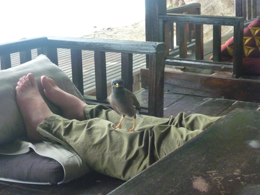 As we enjoyed our breakfast, there were a few birds floating around hoping to get some scraps. This bird got super brave and jumped on Kyde's leg. Kyde has a phobia of animals biting her and she's really not fond of birds, but she held her composure!